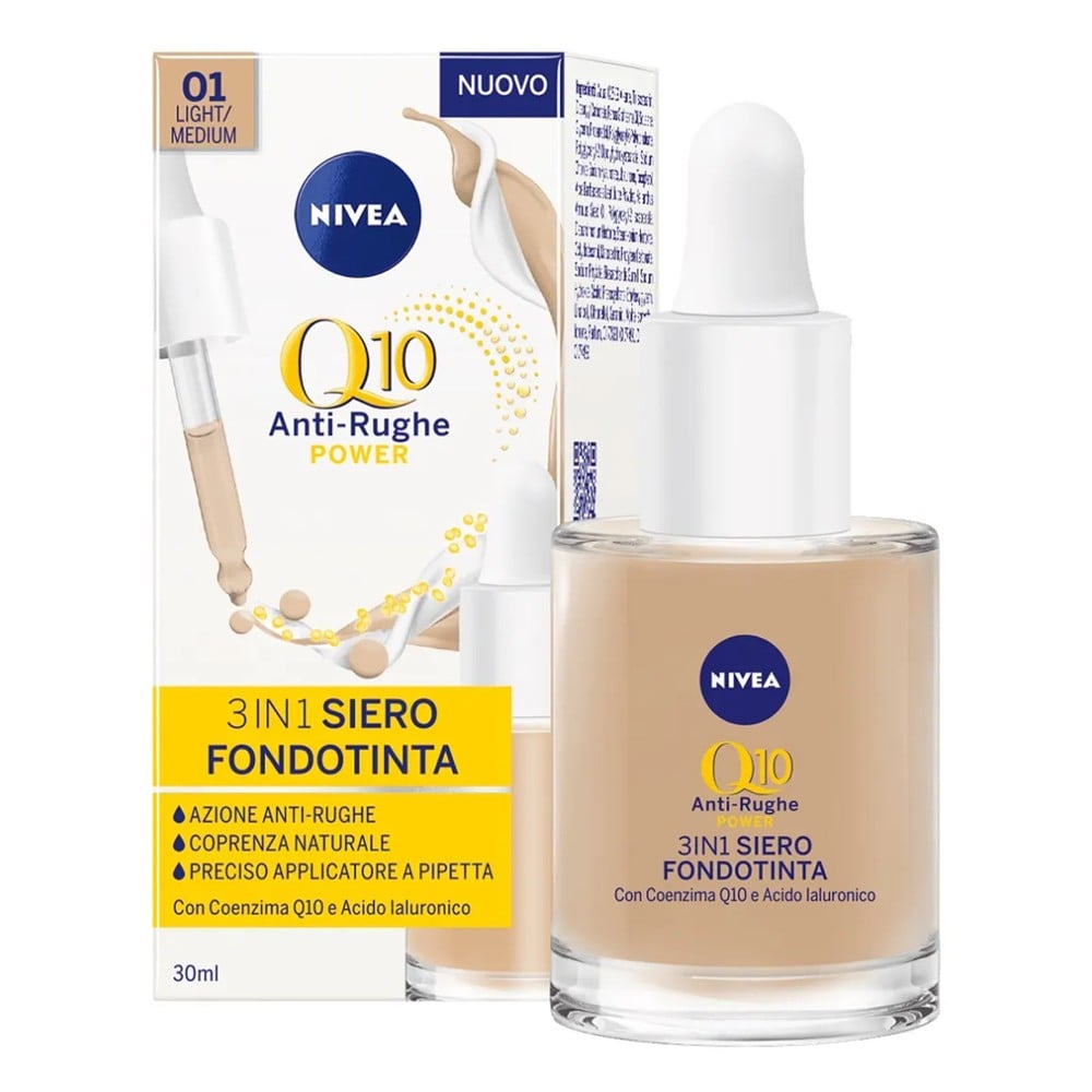 Nivea Q10 me efektivitetin e një serumi kundër rrudhave i kombinuar me pigmente me ngjyra natyrale. Falë një koncentrati efektiv të përbërësve aktivë kundër plakjes, formula ndihmon në reduktimin e dukshëm të linjave të imta dhe rrudhave. Lufton rrudhat falë fuqisë antioksiduese të koenzimës Q10. Pigmentet e ngjyrave përzihen në mënyrë të barabartë me lëkurën dhe përshtaten natyrshëm me tonin e saj, duke mbuluar menjëherë papërsosmëritë e vogla. E pasuruar me vaj avokadoje dhe acid hialuronik, formula e lehtë hidraton për 12 orë, për lëkurë me efekt mëndafshi.
