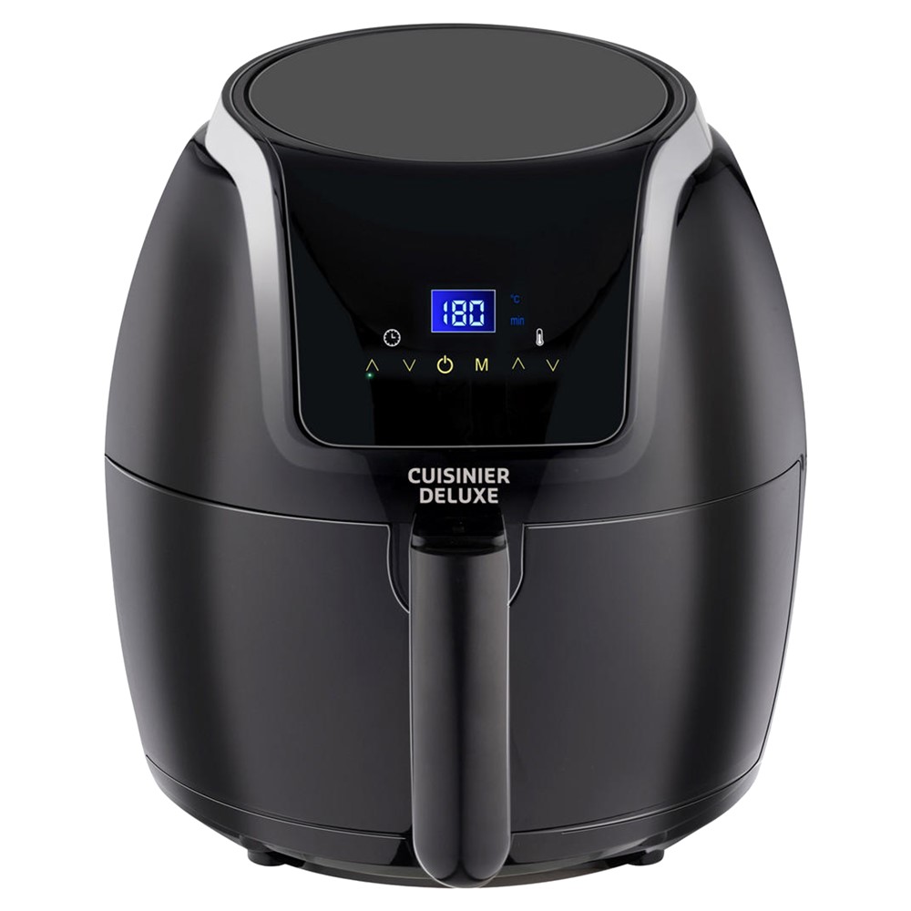 Përgatitni patatet e skuqura dhe ushqimet më të shijshme me lehtësi me këtë fritezë me ajër shumë të madhe dhe dixhitale. Mund të shijoni gatime më pak yndyrore në një çast. Për shkak se nuk përdoren yndyrna, pjatat nga kjo fritezë ajri janë natyrisht shumë më të shëndetshme se sa kur përdorni një tiganisje të modës së vjetër me yndyrë të thellë. Me këtë Airfryer Cuisinier me kontroll dixhital ju keni mundësi të pafundme. Operacioni është i thjeshtë dhe dixhital. Është e mundur të vendosni kohën dhe temperaturën e dëshiruar. Airfryer ka një kosh të përshtatshëm të lëvizshëm me një shtresë jo ngjitëse dhe mund të pastrohet lehtësisht.