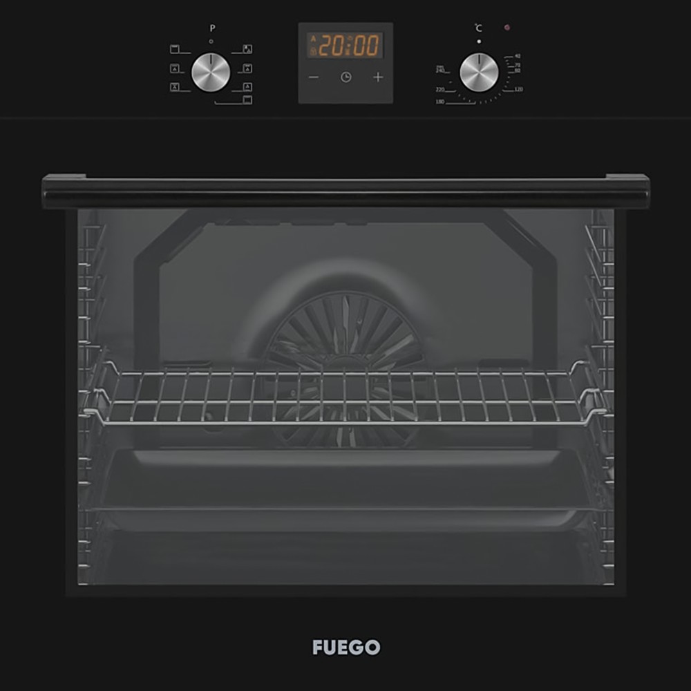 Furrë inkaso Fuego me kapacitet 80 Lt. Smalt i zi dhe xham i zi në derë. Butonat e zinj. Me një timer mekanik. 8 funksione. Grill + ventilator. Klasa e energjisë A.