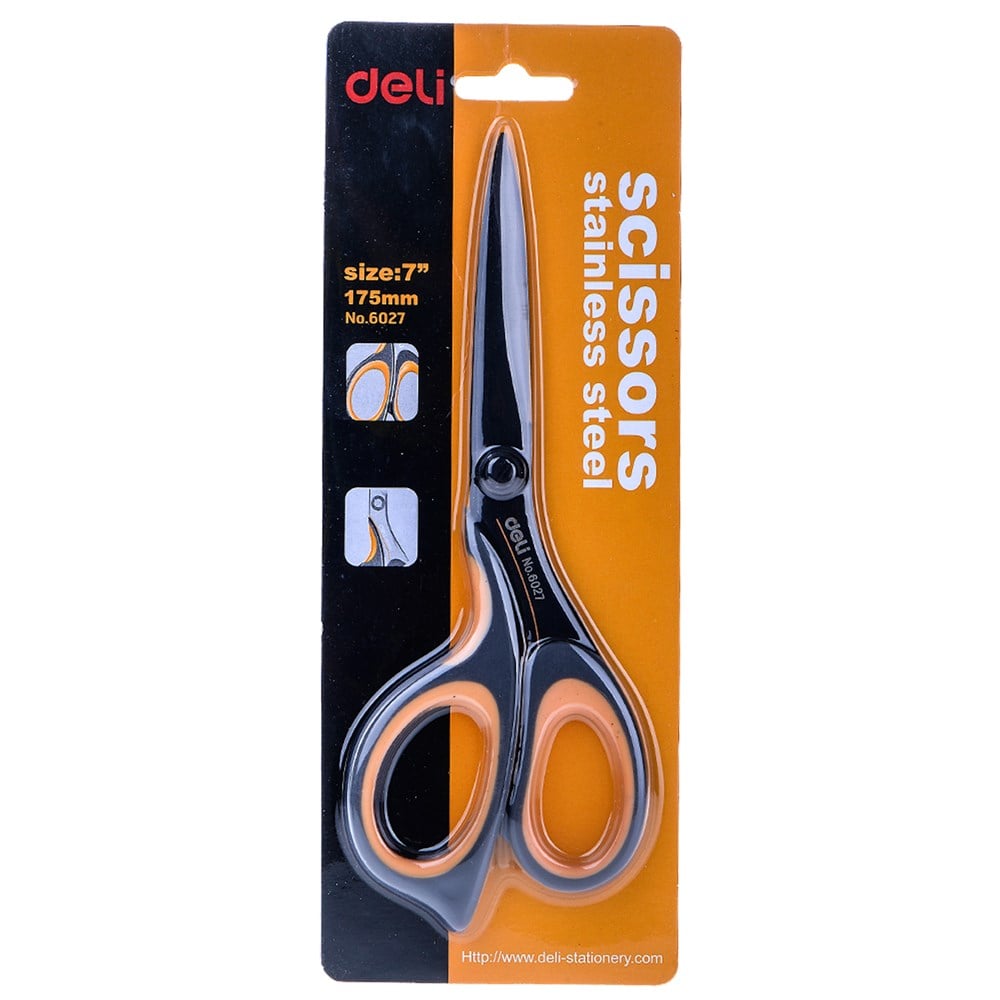 Gërshërë, modeli 6027, prej materiali inoksi të qëndrueshëm, me gjatësi 17.5 cm, me dorezë plastike, në ngjyrë të zezë, të verdhë dhe gri. Doreza ka veshje prej gome të butë, me veti ergonomike për një përdorim më të lehtë. Përdoret për prerjen e letrës dhe kartonit të hollë, gjithashtu edhe për prerjen e letrës ambalazhuese, copave të tekstilit, etj. Ky produkt është i përshtatshëm për përdorim profesional dhe jo-profesional.
