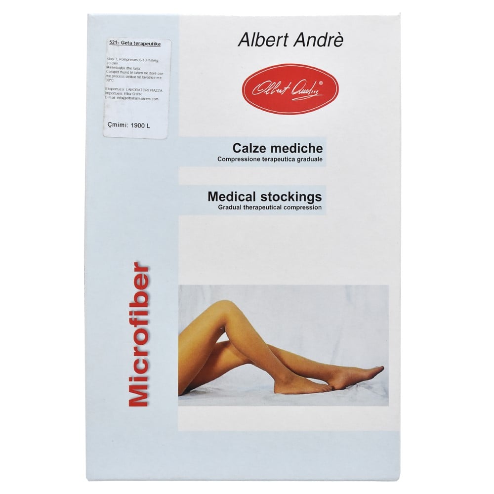 Geta mjekësore kompresimi për femra, modeli 521, të përbëra prej materiali mikrofibër elastike, me një dendësi të thurjes prej 70 denier. Materiali përbërës është i butë, i bën getat të lehta për t'u veshur dhe lejon ajrosjen e këmbës. Mënyra e përdorimit: Getat e klasit 1 (parandaluese, 14-18 mmHg) kanë një nivel të ulët kompresioni dhe janë të përshtatshme në përdorim: 1. për trajtimin e sindromës post-flebitike, 2. për trajtimin e insuficiencës venoze të lehtë, 3. për trajtimin e edemave të lehta (trauma, distorcione, shëmbje) të arteve inferiore, 4. si masë parandaluese para dhe post operatore tek pacientet me risk flebiti, 5. për trajtimin e flebitit, 6. si masë plotësuese kundrejt skleroterapisë, 7. për trajtimin e patologjive të tjera sipas rekomandimit të mjekut. Të mos përdoren në raste të: 1. ulçerave dhe plagëve, 2. simptomave të dermatitis, 3. djegieve, 4. simptomave të alergjisë ndaj materialeve që përbëjnë çorapet, 5. në të gjithë rastet, në të cilat mjeku nuk e sheh të arsyeshëm përdorimin e tyre. Mirëmbajtja dhe larja: Përdorimi dhe larja e shpeshtë nuk ndikojnë tek funksionaliteti i produktit. Çorapet mund të lahen me dorë ose me proces delikat në lavatriçe me 30°C. Çorapet duhet të thahen larg çdo burim nxehtësie (kalorifer, diell). Mos i thani çorapet tek makina tharëse e rrobave. Mos i hekurosni.