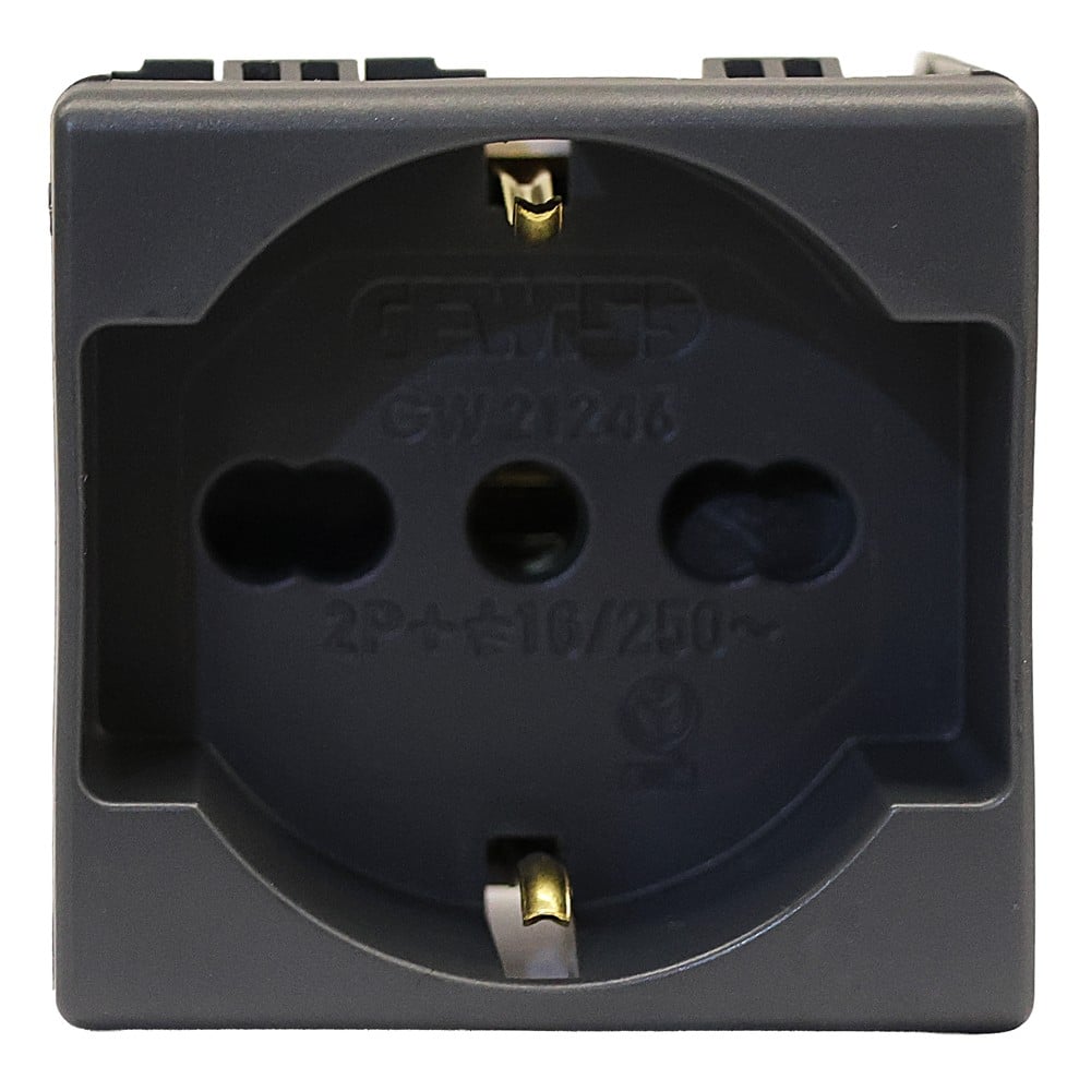 Prizë shuko universale GEWISS 2P+T, 16A, ngjyrë e zezë. Ofron lidhje të sigurt dhe kompatibilitet me shumicën e pajisjeve elektrike, e përshtatshme për instalime shtëpiake dhe profesionale. Dizajn modern dhe integrim i plotë me seritë modulare GEWISS.