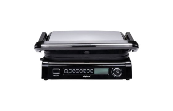 Me këtë grilë skarë shumëfunksionale nga Alpina ju mund të përgatisni shumë produkte të ndryshme në një mënyrë të thjeshtë. Falë mënyrave të ndryshme të skarës dhe mënyrës së gatimit inteligjent, pjekja në skarë bëhet shumë e thjesht për të gjithë. Pllakat e pjekjes janë të pajisura me një shtresë që nuk ngjit dhe secila ka një sipërfaqe prej 32 x 25 centimetra. Ato mund të mbyllen së bashku dhe të përdoren si prodhues sanduiçësh ose grill për panini, ose mund të kthehen në një kënd prej 180 ° për sipërfaqe shtesë horizontale. Kjo pajisje për skarë ofron një gamë të gjerë mundësish falë zgjedhjes së 7 pozicioneve të ndryshme të skarës, nga ushqimi i ngrirë dhe peshku deri te hamburgerët dhe proshuta. Butonat në pjesën e përparme të pajisjes janë të pajisur me ikona të dallueshme për përdorim të lehtë. Duke zgjedhur një pozicion specifik të skarës, pajisja e skarës përshtatet me temperaturën dhe kohën më të mirë për atë produkt ushqimor specifik. Mund të lexoni në ekranin dixhital kur grila të jetë gati. Ju gjithashtu keni mundësinë të vendosni vetë temperaturën dhe kohën nëse preferoni të mos përdorni një nga programet e para-programuara.
