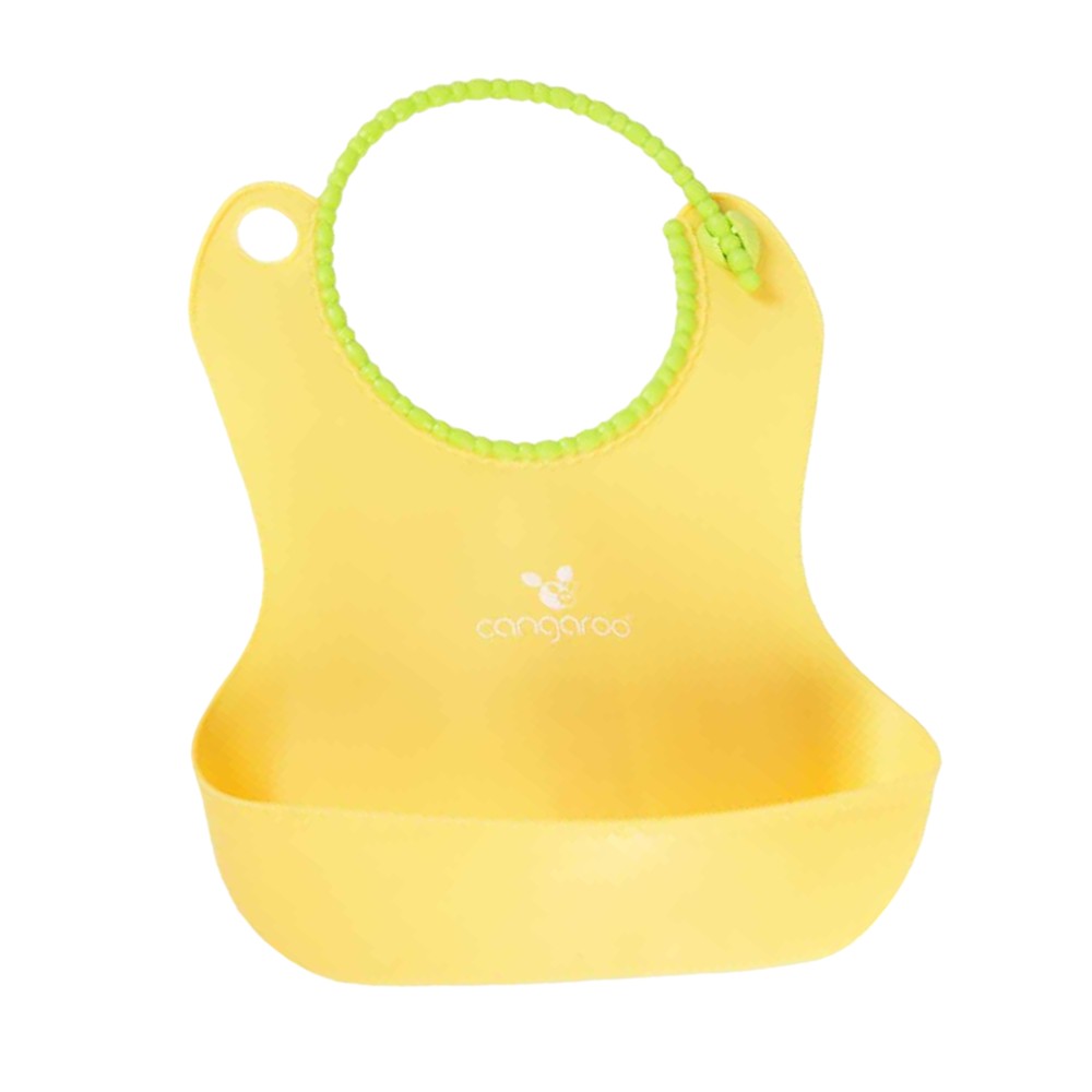 Gushore silikoni Cangaroo në ngjyrë të verdhë. Gushorja ka një xhep dhe është e bërë nga silikoni i butë. Mbron rrobat e bebes nga njollat. Kapëse e rregullueshme.