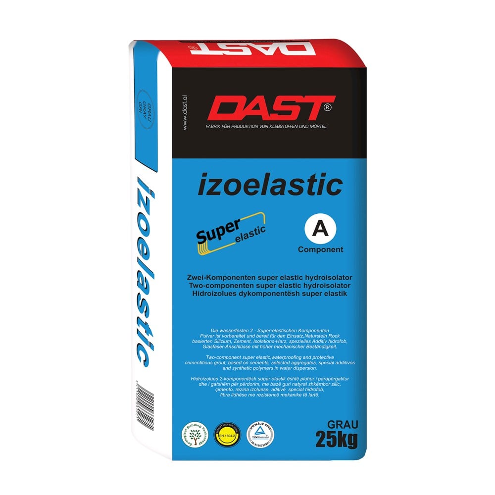 Material dy komponentësh elastik me bazë çimentoje, shumë rezistent ndaj ujit me presion. Shërben për të kryer hidroizolimin e sipërfaqeve në kontakt të shpeshtë me ujin dhe lagështirën. I përshtatshëm për themele ndërtesash, pishina, taraca etj. Shtrimin e membranave hidroizoluese përpara vendosjes së pllakave për brenda dhe jashtë. ● Mbrojtje fleksibile dhe rezistente ndaj ujit e lagështirës për sipërfaqet e betonit dhe suvatë. ● Veshje hidroizoluese dhe mbrojtëse e sipërfaqeve të betonit, subjekt i agresionit kimik, si kripërat anti-ngricë, sulfatet, etj. ● Nivelim hidroizolues dhe fleksibël i suvave të plasaritura. ● Sa më i madh është presioni i ujit aq më i trashë duhet aplikuar produkti. ● Veshje hidroizoluese dhe mbrojtëse e mureve në themele. ● Nivelim fleksibël i strukturave të betonit me seksione të holla, subjekt i dëmtimeve nga peshat (p.sh. strukturat e parafabrikuara). ● Hidroizolim i pishinave me beton të maturuar (mbi 6 muaj