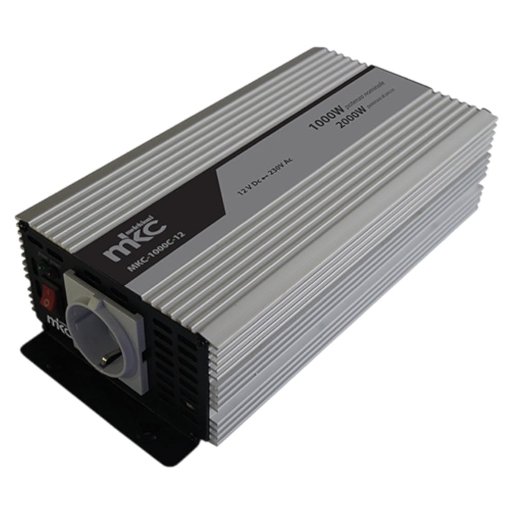 Inverter MKC 1000 W. Tensioni hyrës 12V dc, Tensioni i daljes 220-240V ac, fuqi e vazhdueshme 1000W fuqi maksimale 2000W mbrojtje në formë vale sinusoidale e modifikuar nga mbingarkesat matje të mbrojtjes nga qarku i shkurtër 284 * 135 * 75 mm peshë, përdorimi i kampeve në 18. furgona, kasolle malore, netbook, telefona inteligjentë, karikues baterish, vegla, etj.