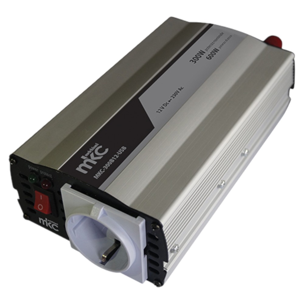 Inverter MKC 300 W. Tensioni hyrës 12V dc Tensioni i daljes 220-240V ac me dalje usb 5V dc 500mA fuqi e vazhdueshme 300W fuqi maksimale 600W mbrojtje në formë vale sinusoidale nga mbingarkesat matjet e mbrojtjes nga qarku i shkurtër 166 * 4mm 5 kg përdorimi: sisteme, varka, kampe, furgona, kasolle malore, netbook, telefona inteligjentë, karikues baterish, vegla, etj.