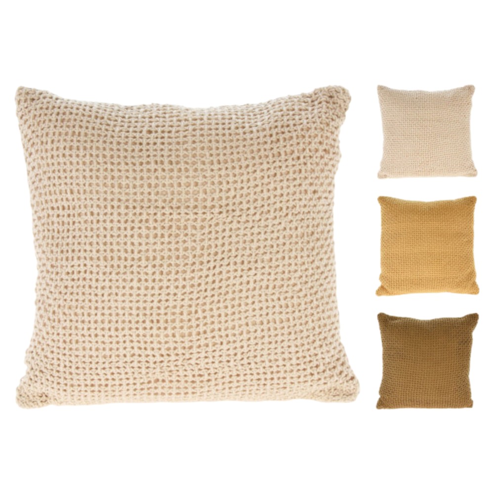 Një jastëk dekorativ me pjesën e përparme të bërë me material të punuar bukur me grep mbi një bazë pambuku dhe pjese te pasme prej pëlhure të lëmuar pambuku. Ky kombinim ju jep një ndjenje unike, që shkon mirë si me ambientet moderne ashtu edhe me ato klasike. Jastëku është i pajisur me një zinxhir, i cili mundëson heqjen e lehtë të mbulesës për larje. Këllëfi i jastëkut është 100% pambuk, duke garantuar butësi dhe frymëmarrje natyrale, ndërsa permbajtja e poliestres ofron elasticitetin dhe komoditetin e duhur të përdorimit.