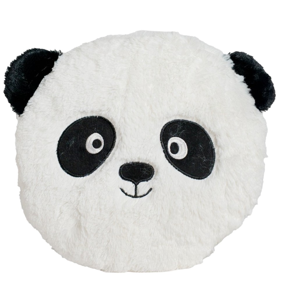 Jastëk dekorues për dhomë fëmijësh me dekor panda, e bërë prej materiali pelushi të butë në ngjyrë të bardhë dhe të zezë me detaje të qëndisura me mbushje filtri në pjesën e brënshme.