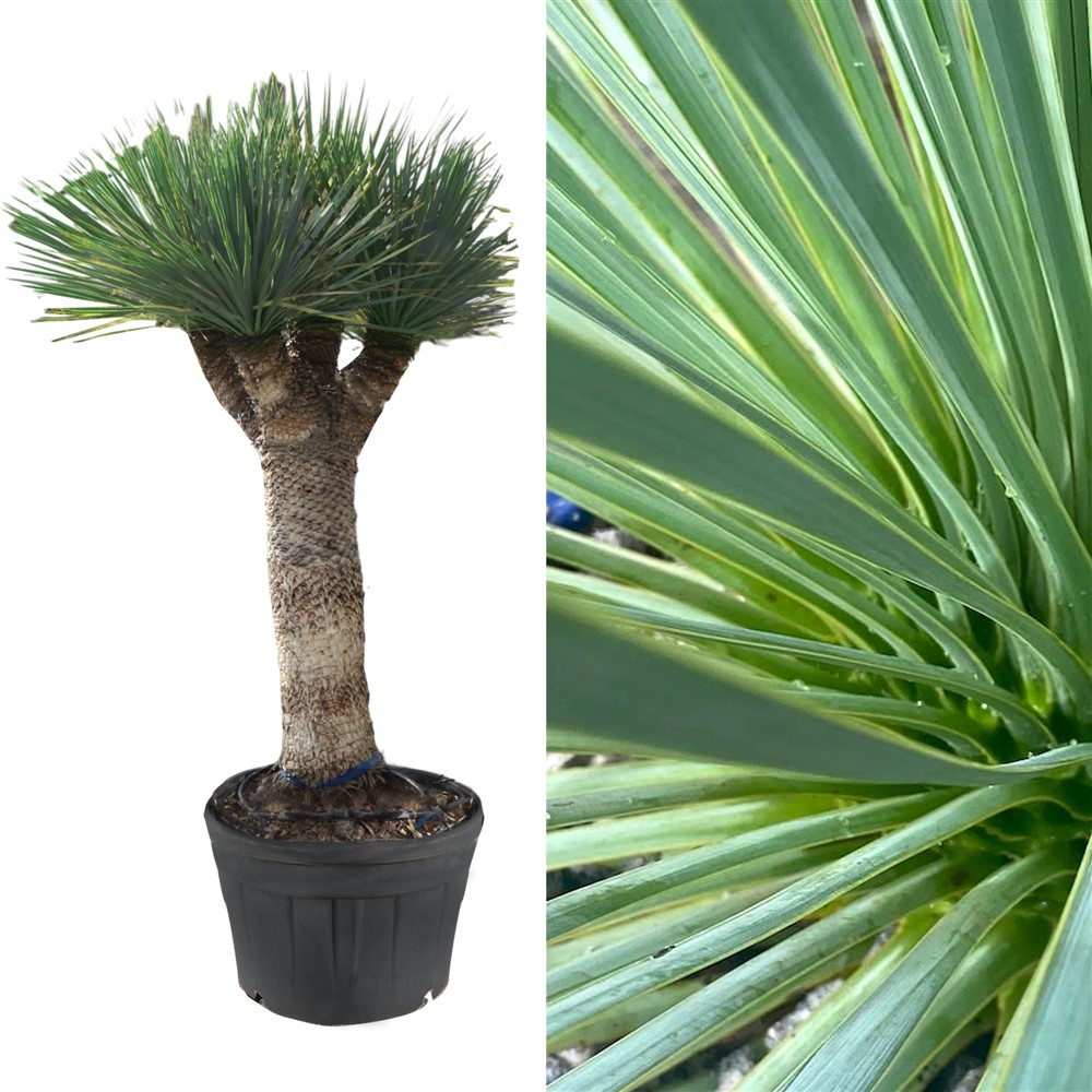 Yucca është një bimë jashtëzakonisht zbukuruese, me rritje të ngadaltë me gjelbërim të përhershëm, me një formë të përkryer simetrike. Forma e saj përfshin qindra gjethe të gjata rreth 60 cm. Gjethet kanë pika të mprehta dhe janë një ngjyrë tërheqëse e zbehtë blu ne jëshile. Rozeta e gjetheve ulet në majë të trungut dhe është i mbuluar me mbetjet e gjetheve të vjetra të cilat janë të buta. Kërcelli të verdhë në portokalli shfaqen në krye të bimës në fund të pranverës. Kërcelli ka tufa me lule të bardha. Kjo bimë e ngjashme me pemën ka gjethe që janë të buta, ndryshe nga varietetet e tjera të yucca. Një nga yucat më të forta për formimin e trungut, toleron të ftohtin -26 deri në -29 C .Ndërsa dielli i plotë është ideal, ai toleron një pjesë të hijes për sa kohë që bie të paktën tre orë diell.