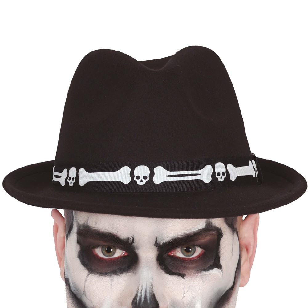 Kapeja për Halloween me temën e skeletit është një aksesori i shkëlqyer për të shtuar një ndjesi tmerruese dhe të misterioze në kostumin tuaj të Halloween-it. Kjo kapelë është krijuar me kujdes me material poliestër, dhe vjen në ngjyrën bazë të zezë, duke pasur një dizajn tërheqës dhe unik me kocka. Kapeja është e ngjashme me një kapelë të zakonshme me një ngjyrë të zezë dhe është dekoruar me një dizajn të skeletit të bardhë në fund. Skeleti është i qartë dhe i detajuar, dhe ai bën që kapela të duket e frikshme dhe e përshtatshme për festën e Halloween-it.
