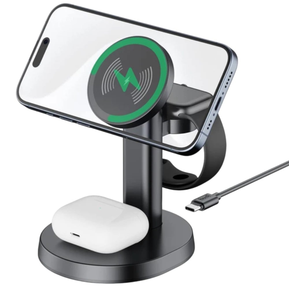 Mbajtëse celulari dhe karikues 3 në 1. Ky produkt unik dhe shumë funksional arrin që të suportojë dhe të siguroj me karikim pajisjet tuaja më të rëndësishme si celulari, ora smart dhe kufjet wifi. Me fuqi 20 W kjo pajisje multifunksionale arrin që të shpërndaj fuqinë e saj duke karikuar me fuqi 15 W celularin, 2.5 W orën dhe 2.5 W kufjet tuaja.Pjesa magnetike e këtij produkti do të siguroj pajisjet tuaja gjatë karikimit por jo vetëm, pasi është edhe një mbajtëse e shkëlqyer për këto aksesorë.