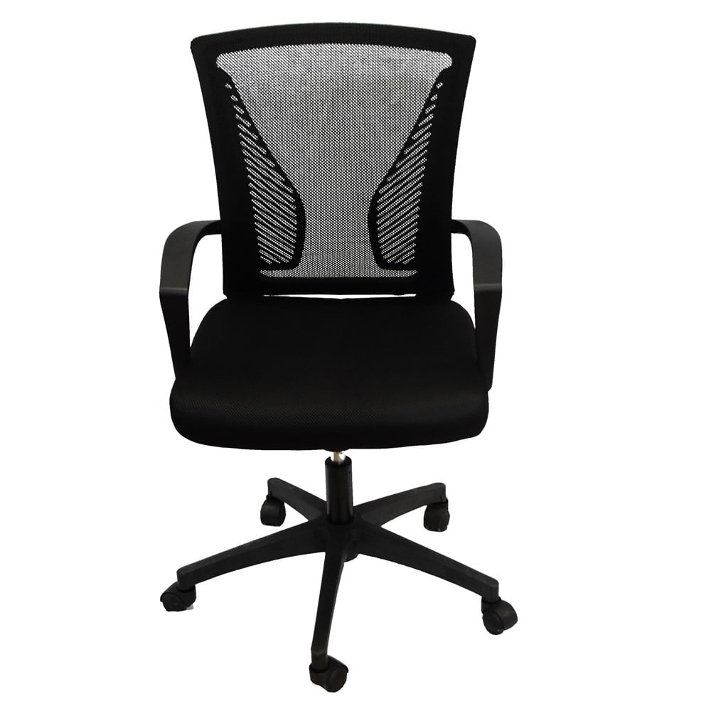 Karrige zyre, këmbë dhe rrota najloni, mbështetëse rrjetëzuar, ulëse veshje tekstil (zezë), pa mbështetëse koke, krahë PP, 55x49xH92-102 cm