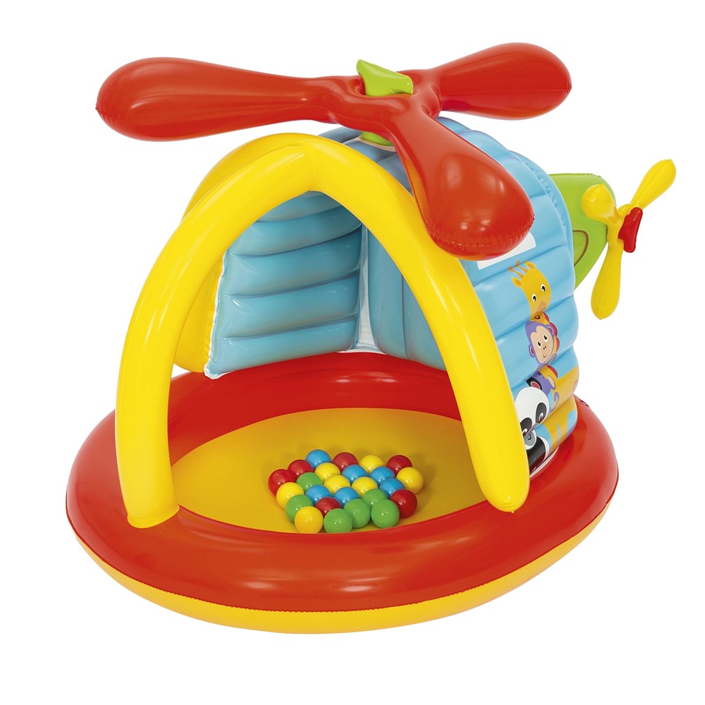 "Kënd lojërash me topa, në formë helikopteri, për fëmijë, prej materiali kloruri polivinili (PVC), me trashësi prej 0.27 mm, të përforcuar dhe të testuar paraprakisht, që e bën të qëndrueshëm ndaj përdorimit dhe objekteve të forta apo të mprehta. Muret anësore mund të fryhen me ajër, gjë që parandalon lëndimin e fëmijëve gjatë lojës. Përdoret si një mënyrë për argëtimin e fëmijëve, është praktik në përdorim, nuk zë shumë hapësirë dhe është i përshtatshëm për t'u vendosur në ambiente të brendshme. Ndihmon në zhvillimin e aftësive motorike, aftësive të koordinimit dhe në zhvillimin e shqisave tek fëmijët e vegjël. Mund të montohet dhe çmontohet lehtësisht për vetëm 30 minuta, duke përdorur një pompë ajri. Seti gjithashtu përmban: