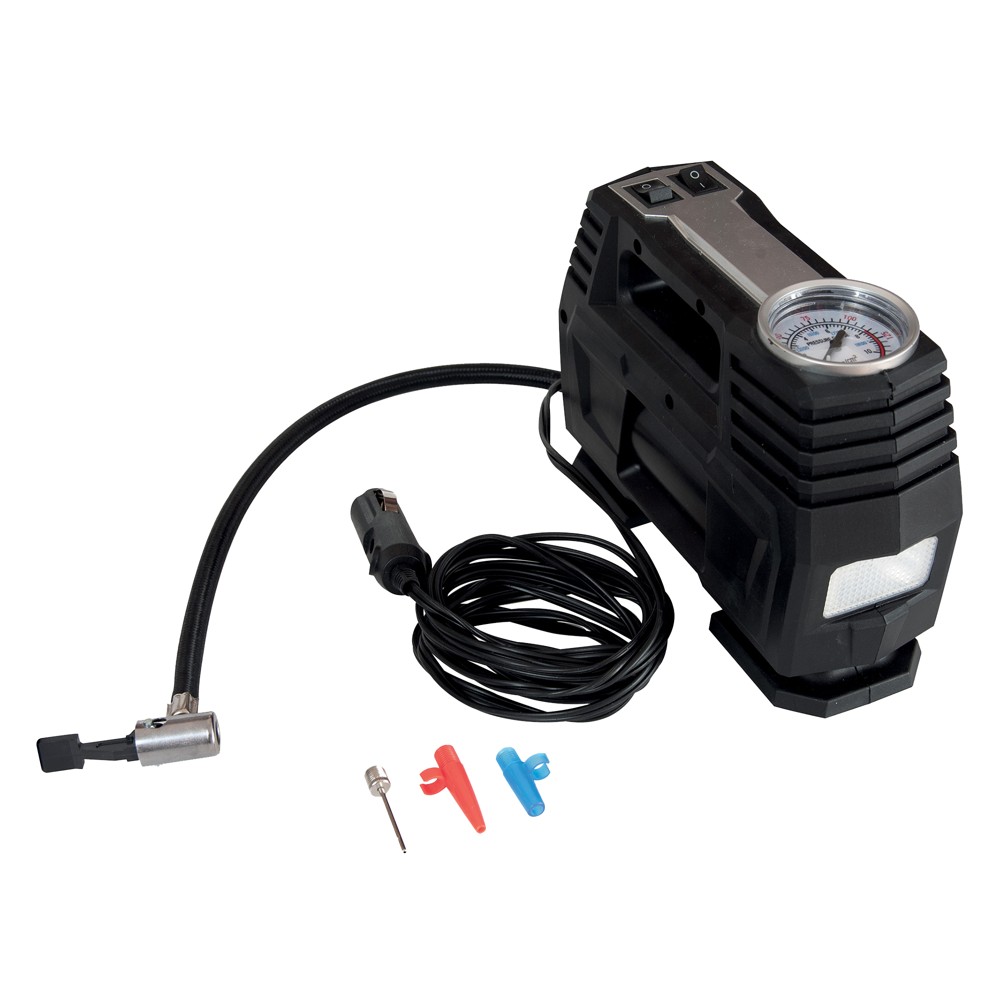 Furnizimi me energji elektrike: 12V DC Presioni maksimal: 150 PSI Gjatësia e kabllit: 2.80 m Zorra e ajrit: 50 cm Cilindri: 19 mm Amperazhi maksimal: 10 amper Vëllimi i ajrit: 30L/min I pajisur me pishtar pune Set me 3 aksesorë të përfshirë