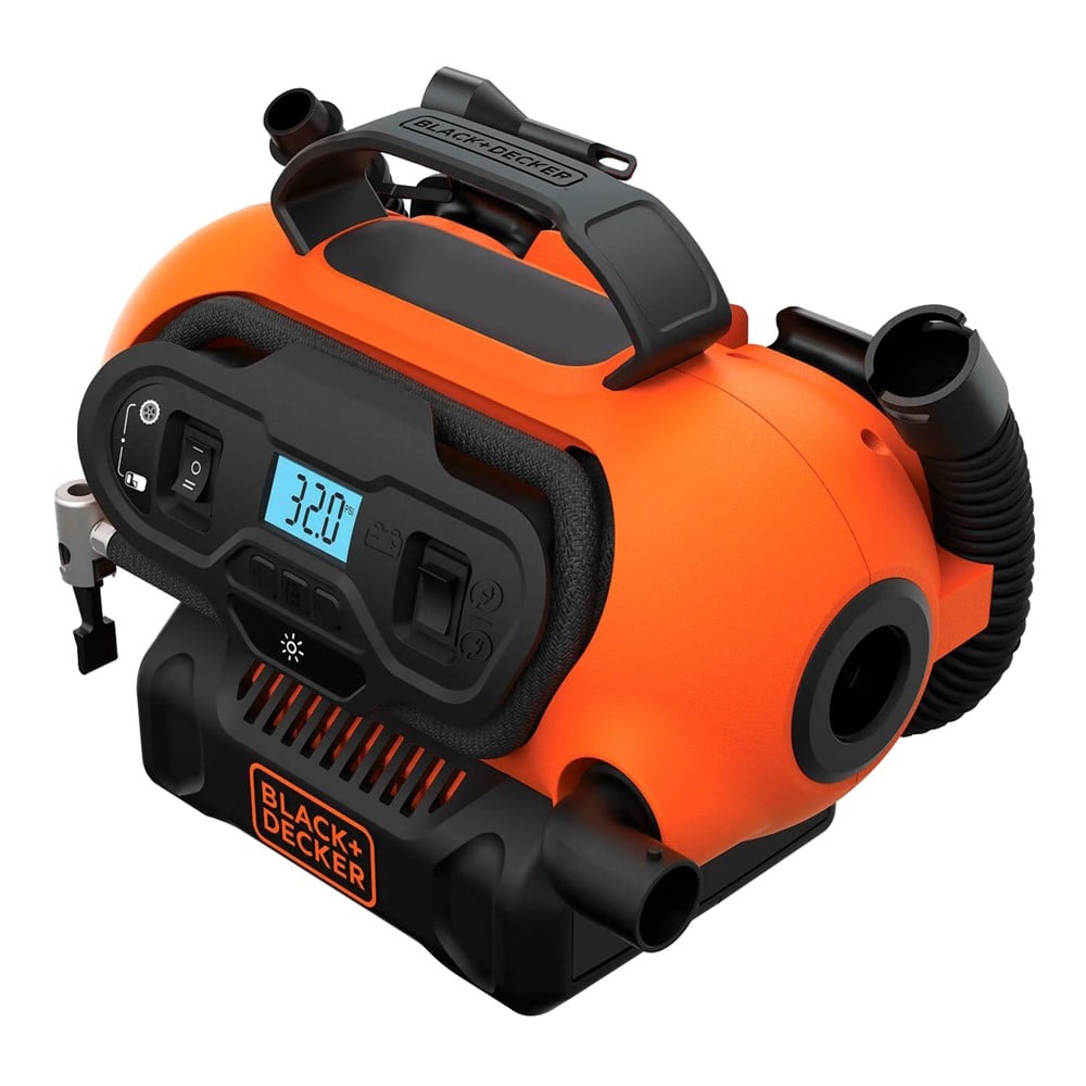 Projektuar me fokus në prakticitetin dhe efikasitetin e lartë gjatë punës. Ndërtuar nga materialet më të cilësisë më të lartë dhe ndërtuar në mënyrë inteligjente, për të zënë sa më pak hapësirë të jetë e mundur në automjetin tuaj. I përshtatshëm për fryrjen e gomave të makinave, SUV, furgona, motoçikleta etj. Gjithashtu kompresori është i përshtatshëm edhe për fryrjen e produkteve si dyshekë me ajër, pishina etj. Multifunksionaliteti i këtij mjeti dallohet në mundësitë e shumta të funksionimit, nëpërmjet rrymës elektrike 220 V, me anë të folesë ndezëse të makinës 12V dhe me anë të baterive Black and Decker 18 V.Bateria nuk përfshihet në paketim.