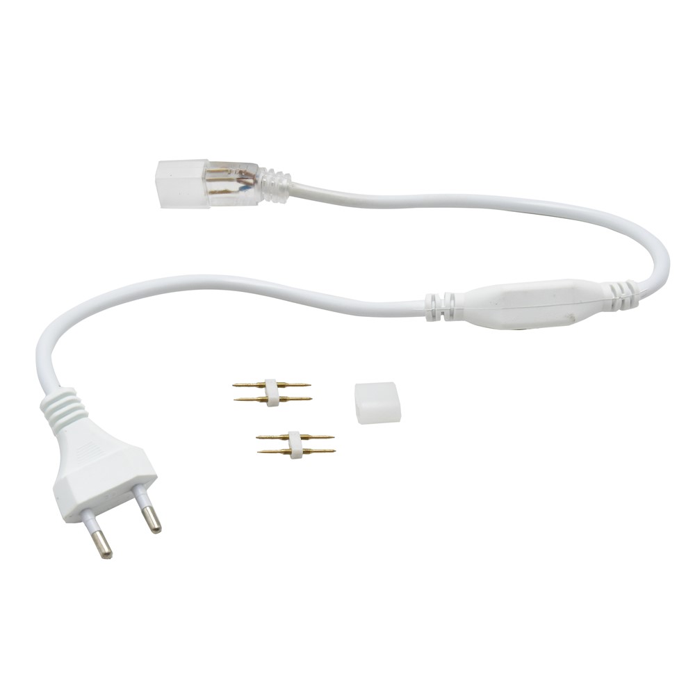 Zgjatues konektor për shirit LED me gjatesi 20 cm. Ky konektorë shërben për lidhjen e shiritit LED ne rrjet 220 V, mundëson lidhjen e shiritit led me gatësi deri në 50 m.
