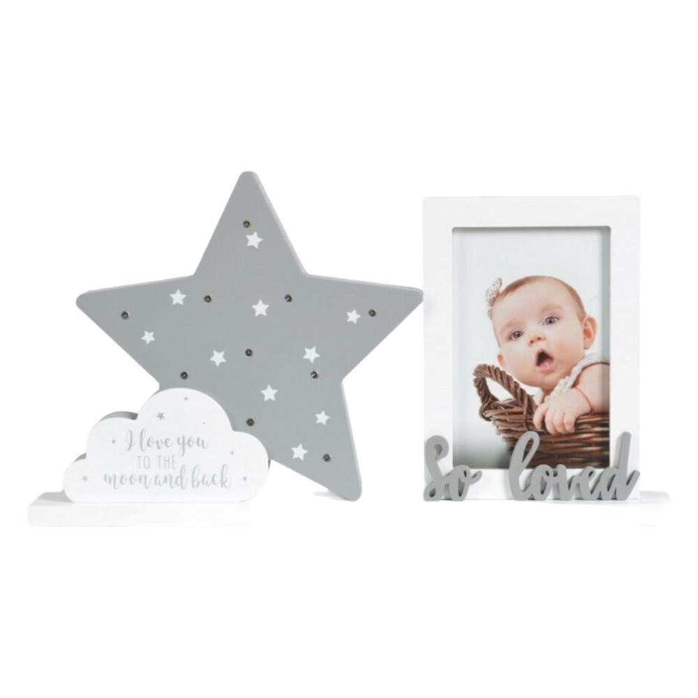 Kornizë fotografish për fëmijë, nga Cangaroo. Korniza është prej materiali druri në përmasa 8x37x21 cm. Ajo ka projektuar një yll, një hënë dhe hapësirën për vendosjen e fotos.
