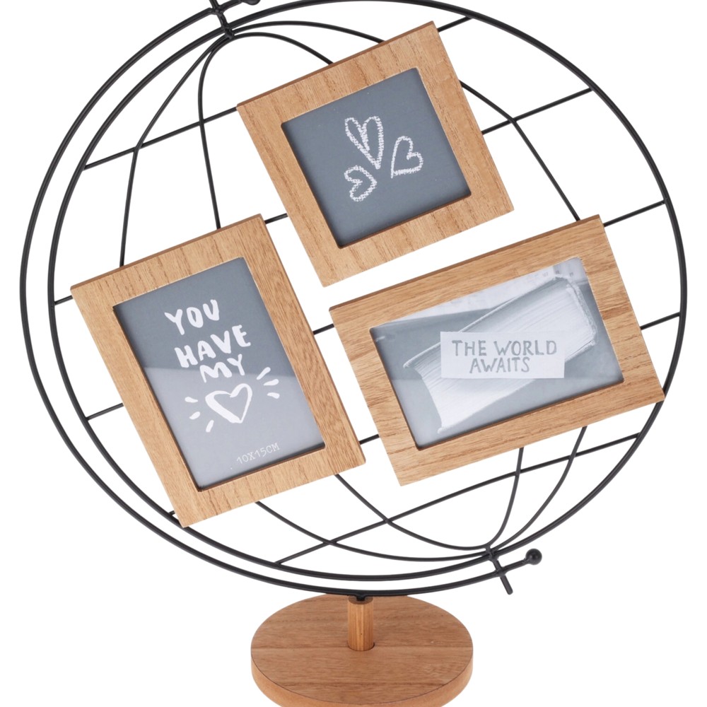 Stili unik i kësaj kornize fotosh do të rrëmbejë menjëherë vëmndjen tuaj dhe mysafirëve. Po ashtu ajo do të jetë një dhuratë ideale për të dashurit tuaj. Vjen në formën e një globi dhe mund të ekspozoni fotot tuaja nga udhëtime të ndryshme duke krijuar një mozaik interesant në raftet apo tavolinat tuaja. Struktura metalike në formën e një globi ka tre korniza të përmasave të ndryshme ku duket edhe më interesante dhe mund të shërbejë edhe si një objekt dekorues. Përmasat e globit janë 42x45 cm, ideale për të krijuar kompozime në rafte.