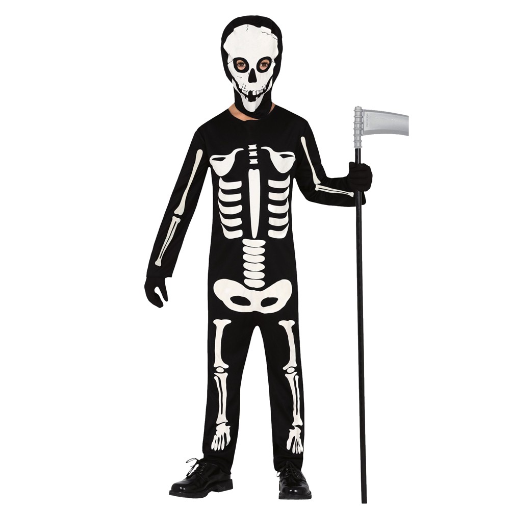 Kostum skeleton për fëmijë, prej materiali poliestre, në ngjyrë të zezë. Materiali përbërës është i butë në prekje dhe nuk shkakton irritim në lëkurë. Ky produkt është i përshtatshëm për përdorim nga fëmijë të moshës 5-6 vjec me gjatësi 110 cm deri në 115 cm .