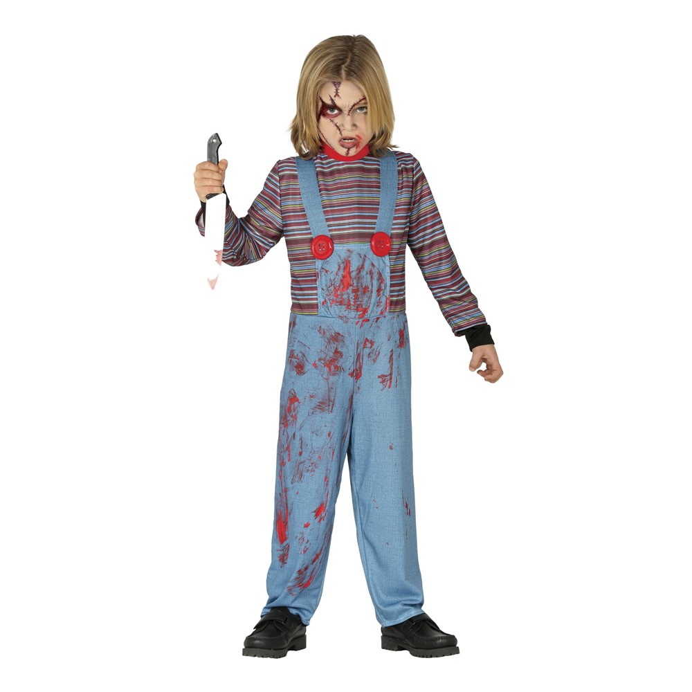 Kostum për fëmijë meshkuj Possesiv boy, prej materiali 100 % poliestër, në ngjyrë të kaltër me spërkatje imitim gjaku. Veshja përbëhet nga kominoshet me një bluzë të rremë të ngjitur. Thika nuk përfshihet në paketim por gjendet si aksesor vec. Veshja e kukullave do të jetë ideale për t'u shndërruar në një personazh horror të frikshëm gjatë Halloween!