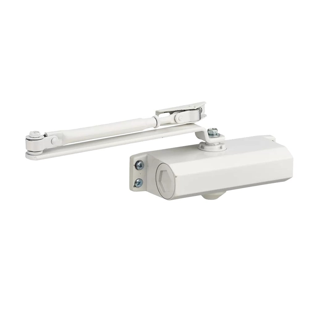 Hydraulic door closer. Can be mounted on the right or left. Adjustment of closing speed and final stop is done with a screw.