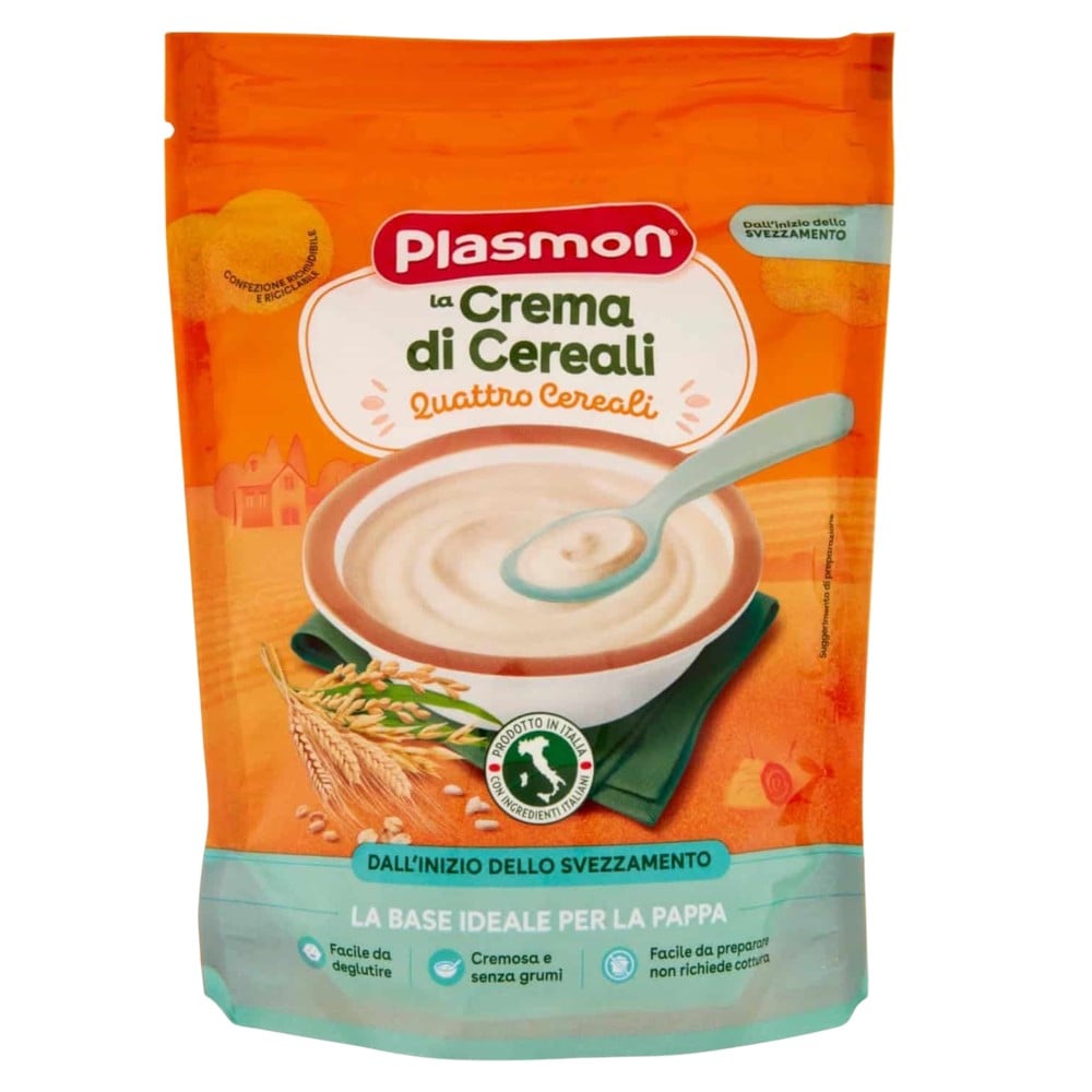Krem drithërash për fëmijë, Plasmon, La Crema Di Cereali Quattro Cereali. Përbërësit: Miell drithërash (gruri (50%), oriz (19%), elbi (17%), tërshërë (11%), Fosfate kalciumi, Karbonat kalciumi, Vitamina C, Niacin, Acid pantotenik, Riboflavinë, Tiaminë, Vitamina B6. Mund të përmbajë gjurmë mustarde, soje.