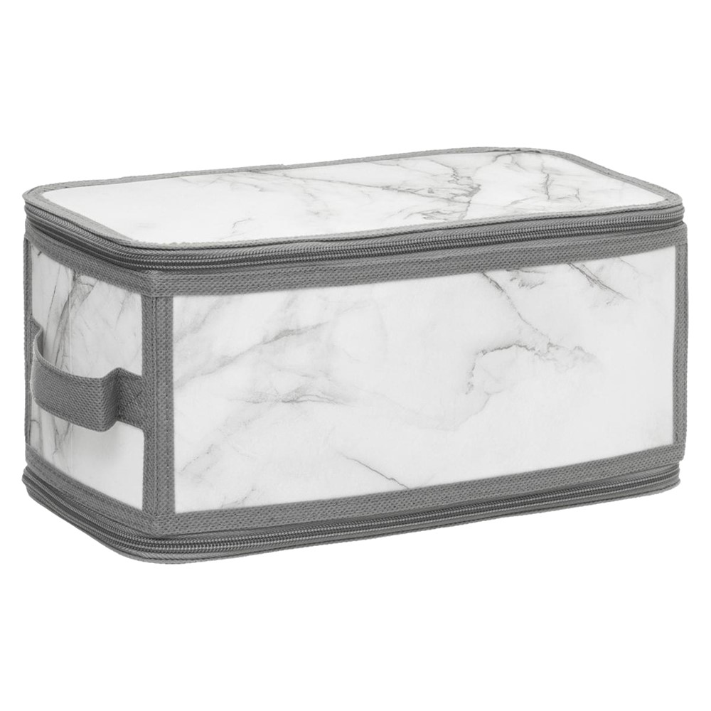 Kuti kozmetike në material karton- tekstil , në përmasë 30x15x15 cm, e pajisur me një zinxhir për mbyllje dhe një dorezë për trajtim të lehtë. në ngjyrë gri e të bardhë. Perdoret per ruajtjen e rrobave, revistave, fotove, apo dhe aksesorëve kozmetikë. Kutia është e palosshme dhe ju ofron mundësinë e kursimit të hapësirës.