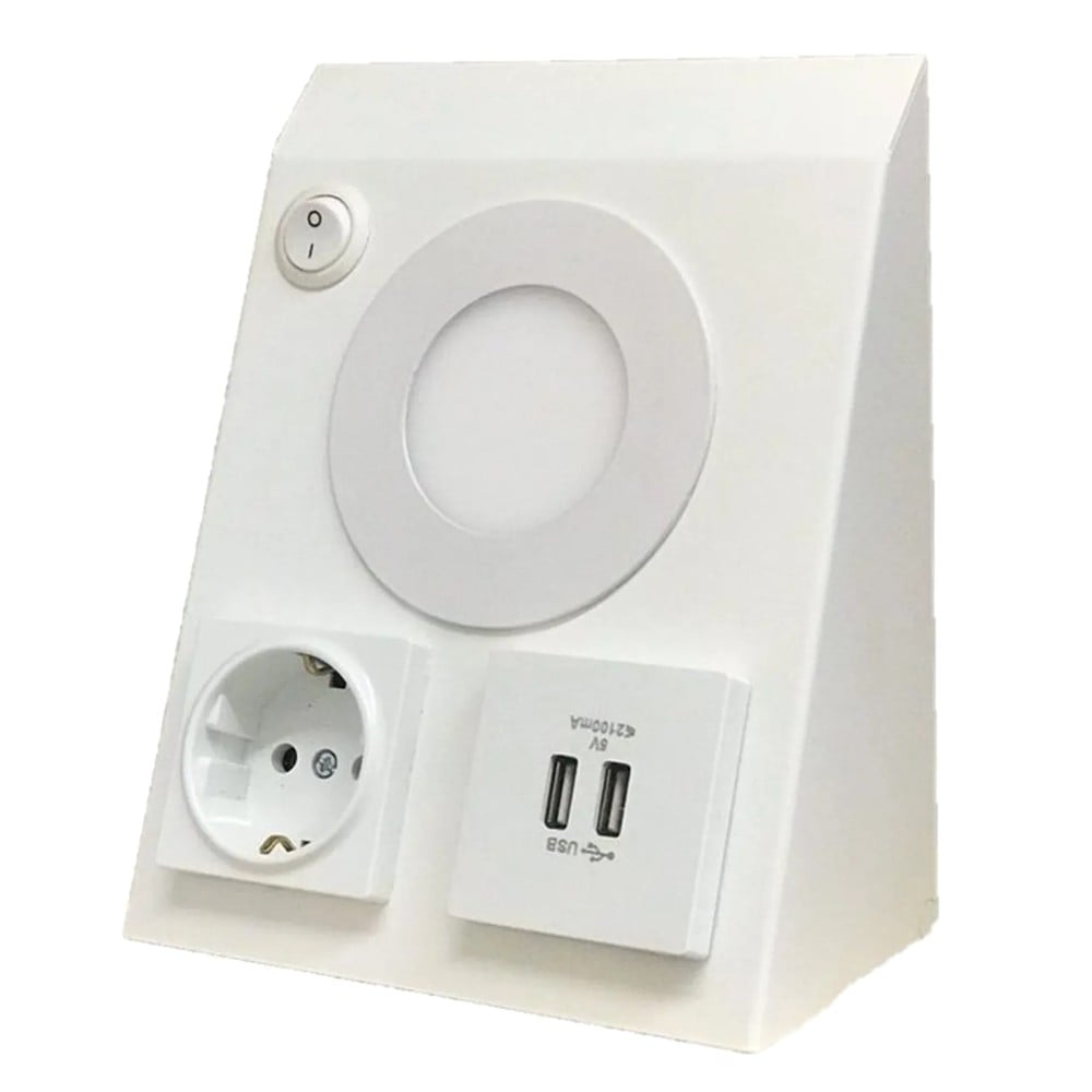 Kuti me nje prize shuko, 2 usb dhe ndricim te bardhe te ftohte, 17x7.5x14 cm, metalike, e bardhe