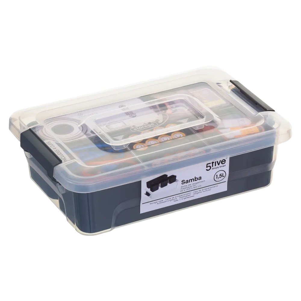 Keni nevojë të organizoni në mënyrë praktike sendet tuaja dhe të eliminoni rrëmujat? Kutia e organizimit ''Samba'' e ideuar nga 5FIVE Simply Smart ju vjen në ndihmë. Prodhuar në material polipropilen në ngjyrë transparente dhe organizues gri. Kjo kuti është e përbërë nga 1 kontenitor transparent, 1 kapak transparent me mbyllje me kapëse, 1 kontenier i brendshëm i gjatë si dhe 3 mini konteniera të brëndshëm. Ky produkt ka një kapacitet prej 1.5 litrash dhe përmasa, lartësia : 6.5 cm, gjatësia : 22 cm, gjerësia : 15.5 cm.