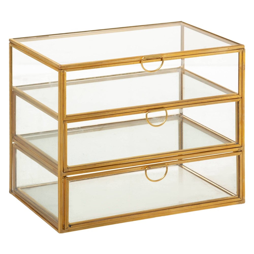 Kuti për bizhuteri, me 3 kate, prej materiali qelqi transparent, me strukturë prej materiali metalik, në ngjyrë gold, me përmasa 18x12x15 cm dhe me pasqyrë në pjesën e poshtme. Përdoret në ambiente shtëpie për organizimin e bizhuterive dhe aksesorëve të ndryshëm me vlerë, duke menaxhuar hapësirat e kufizuara. Ky produkt është i përshtatshëm gjithashtu për përdorim në vitrinat e dyqaneve, për ekspozimin e bizhuterive, orave dhe aksesorëve të tjerë, ekspozimin e thikave, gurëve të çmuar, figurinave metalike, grepave të peshkimit, etj.