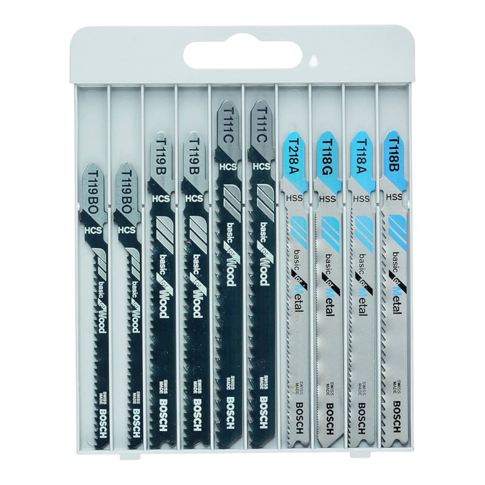 Kompleti përfshin tehe për prerje të drejta dhe të lakuara në dru, duke siguruar që të keni mjetin e duhur për një sërë punësh të ndryshme në përpunimin e drurit. Për më tepër, kompleti është i pajisur me tehe për pjesë metalike, duke ofruar rezultate të besueshme për projektet tuaja të përpunimit të metaleve. Të gjitha tehet janë të përputhshme me çdo lloj sharre që përdoret duke ju ofruar fleksibilitet dhe komoditet. Seti përfshin 2x T 119 BO për dru, 2x T 119 B Basic për dru, 2x T 111 C Basic për dru, 1x T 218 A Basic për metal, 1x T 118 G Basic për metal, 1x T për Metal, dhe 1x T 118 B Bazë për Metal.