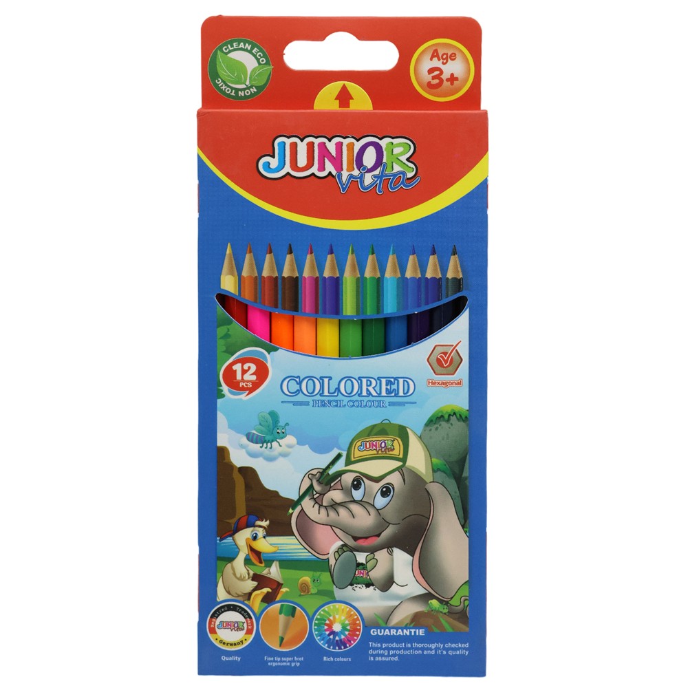 Lapsa me ngjyra Junior Vita Colored, me 12 ngjyra të ndryshme. Çdo laps është i krijuar për të ofruar ngjyra të ndritshme dhe të qëndrueshme, ideale për vizatim. Paketimi përmban 12 lapsa në ngjyra të ndryshme, duke stimuluar kreativitetin dhe imagjinatën e fëmijëve.