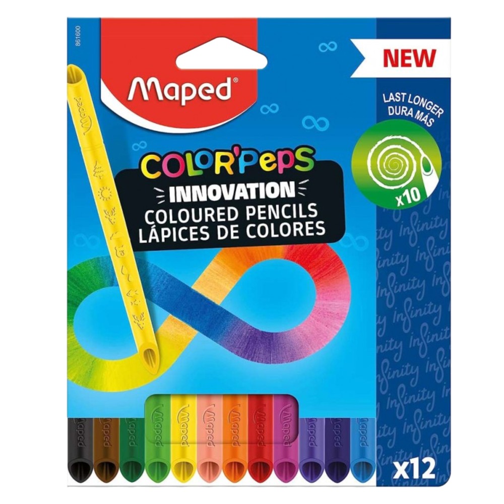 Lapsat Maped Color'Peps Infinity janë një zgjidhje inovative për ngjyrosje dhe vizatim. Dizajni i tyre unik pa drurë i lejon përdoruesit të shfrytëzojnë plotësisht materialin, duke i bërë ato deri në 10 herë më të qëndrueshme se lapsat tradicionalë. Forma e tyre triangulare siguron një kapje ergonomike dhe parandalon rrokullisjen e lapsit gjatë përdorimit. Materiali PlastiClean është i qëndrueshëm ndaj thyerjeve dhe nuk lë mbetje dylli në duar, duke siguruar një përdorim të pastër dhe të rehatshëm.