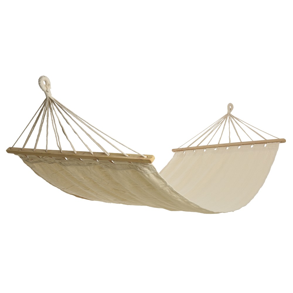 Lëkundëse stili Hammock me material 55 % pambuk dhe 45 % poliestër , ngjyrë e bardhë. E përshtatshme për pëdorim të jashtëm, mundet ta vendosni në një nga bazamentet tona ose mundet të krijoni vetë një vend të përshtatshëm.