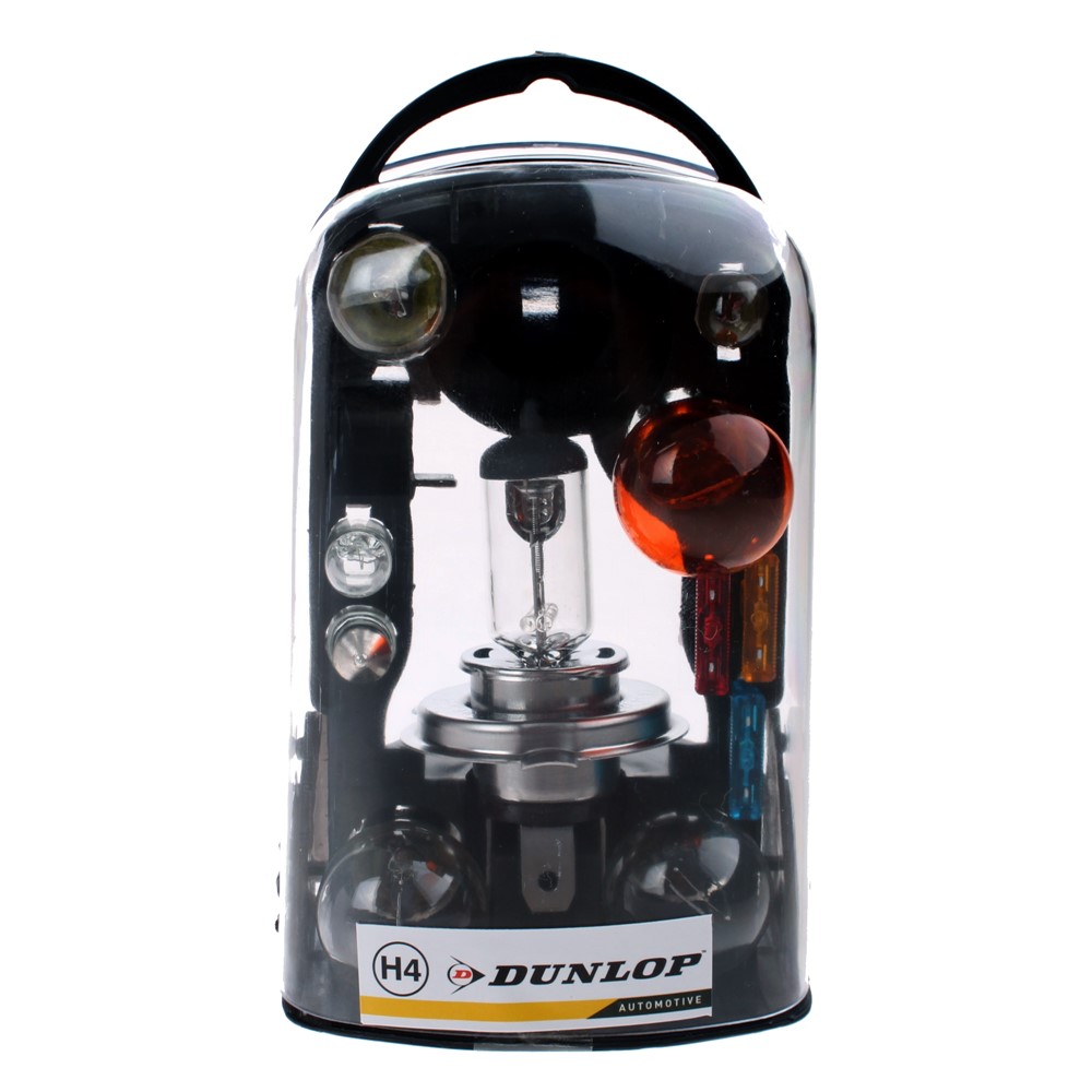 Set me llamba zëvendësuese Dunlop H4. Llambat rezervë janë gjithmonë të domozdoshëme për makinën tuaj. Ky set përmban tetë llamba (1xH4, 1xR5W, 1xT10, 1xP21W/5W, 1xC10W, 1xP21W, 1xT4W, 1xPY21W ), një siguresë 15A, një siguresë 10A dhe një siguresë 5A.