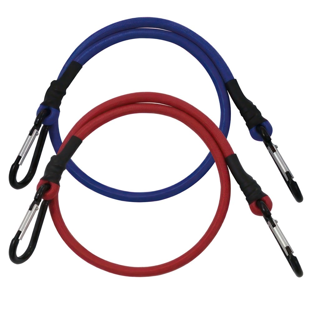 2 llastiqe me grepa kapës. Çertifikuar nga TÜV GS. Forca e tërheqjes: 140 N. Diametri: 10 mm. 1×80 cm, llastik blu. 1×150 cm, llastik i kuq.