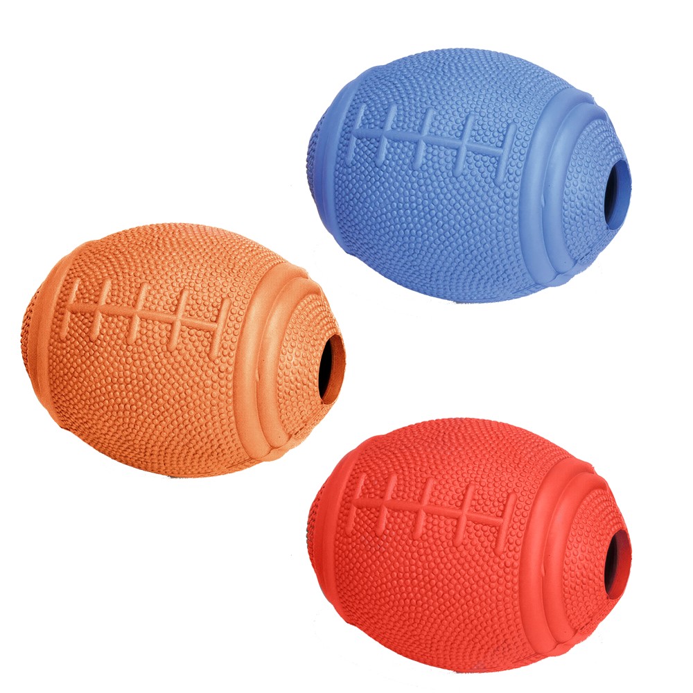 Lodër edukative për qen në formë topi i ndërtuar nga material gome. E disponueshme në 3 ngjyra të ndryshme: portokalli, blu dhe e kuqe.