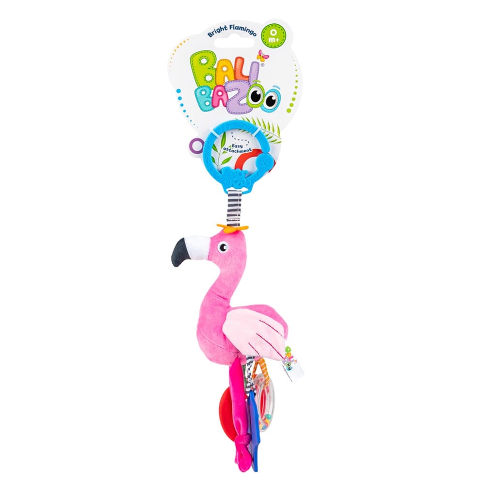 Ky flamingo shumëngjyrësh sjell gëzim dhe argëtim, duke i ofruar foshnjës një përvojë të pasur shqisor. Krahët e zogut janë të dekoruar me dy kafshues të butë dhe shumëngjyrësh, të cilët qetësojnë mishrat gjatë daljes së dhëmbëve. Lodra përfshin edhe një unazë tingëlluese me rruaza të ngjyrosura, që tërheqin vëmendjen dhe stimulojnë shqisën e dëgjimit. E prodhuar nga materiale me tekstura të ndryshme, kjo lodër nxit ndjeshmërinë prekëse dhe e inkurajon foshnjën të eksplorojë botën përmes shqisave. Falë kapëses praktike varëse, flamingoja mund të fiksohet kudo, në karrocë, shtrat, sedilje makine etj.