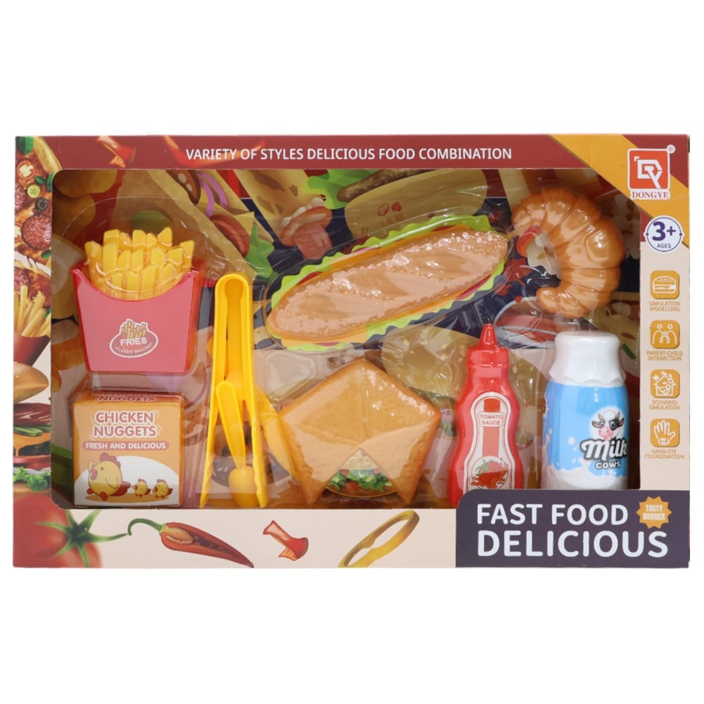 Kjo lodër argëtuese Fast Food Delicious është krijuar për të stimuluar imagjinatën dhe lojën kreative të fëmijëve. Seti përfshin elementë ushqimi fast food të realizuar në detaje nga materiale plastike cilësore dhe të sigurta për fëmijët. Ideal për lojëra role, ndihmon në zhvillimin e aftësive sociale dhe motorike.