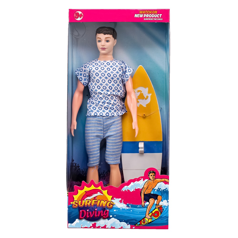 Kukull për fëmijë, e pajisur me tavolinë sërfi, prej materiali plastik, në ngjyra të ndryshme. Kjo lodër ndihmon në zhvillimin e imagjinatës, zhvillimin e shqisave dhe zhvillimin e aftësive të të mësuarit tek fëmijët, përmes lojës në role. Materiali përbërës dhe boja nuk kanë përmbajtje toksike apo të dëmshme për fëmijët dhe produkti është i çertifikuar për siguri në përdorim. Ky produkt është i përshtatshëm për përdorim nga fëmijë të moshës mbi 3 vjeç.