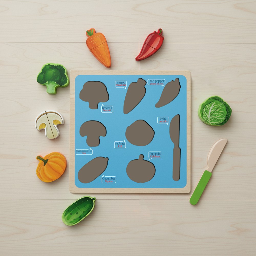 Kjo lodër edukative prej druri është krijuar për t’i ndihmuar fëmijët të njohin dhe të dallojnë ushqimet e përditshme në mënyrë argëtuese. Seti përfshin perime, fruta ose mish të realizuara me detaje të bukura dhe ngjyra të ndezura, duke i dhënë lojës një ndjesi sa më reale. Materiali prej druri është i fortë, i sigurt dhe i qëndrueshëm, duke e bërë lodrën të përshtatshme për përdorim të përditshëm. Kjo lodër ndihmon fëmijët të zhvillojnë imagjinatën, aftësitë motorike dhe njohuritë mbi ushqimet e shëndetshme, si dhe nxit lojën kreative duke imituar gatimin.