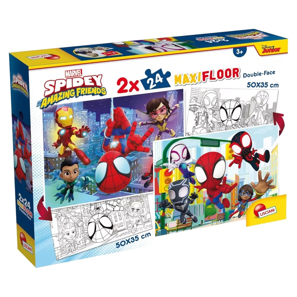 Lodër për fëmijë, Spidey Amazing Friends, Maxi Floor, 2x24, 50x35 cm, double face. E dizajnuar për fëmijët mbi 3 vjeç, kjo lodër ofron dy imazhe të ndryshme dhe mund të përdoret në dy anët. E përshtatshme për lojëra dhe argëtim, me dimensione ideale për fëmijët.
