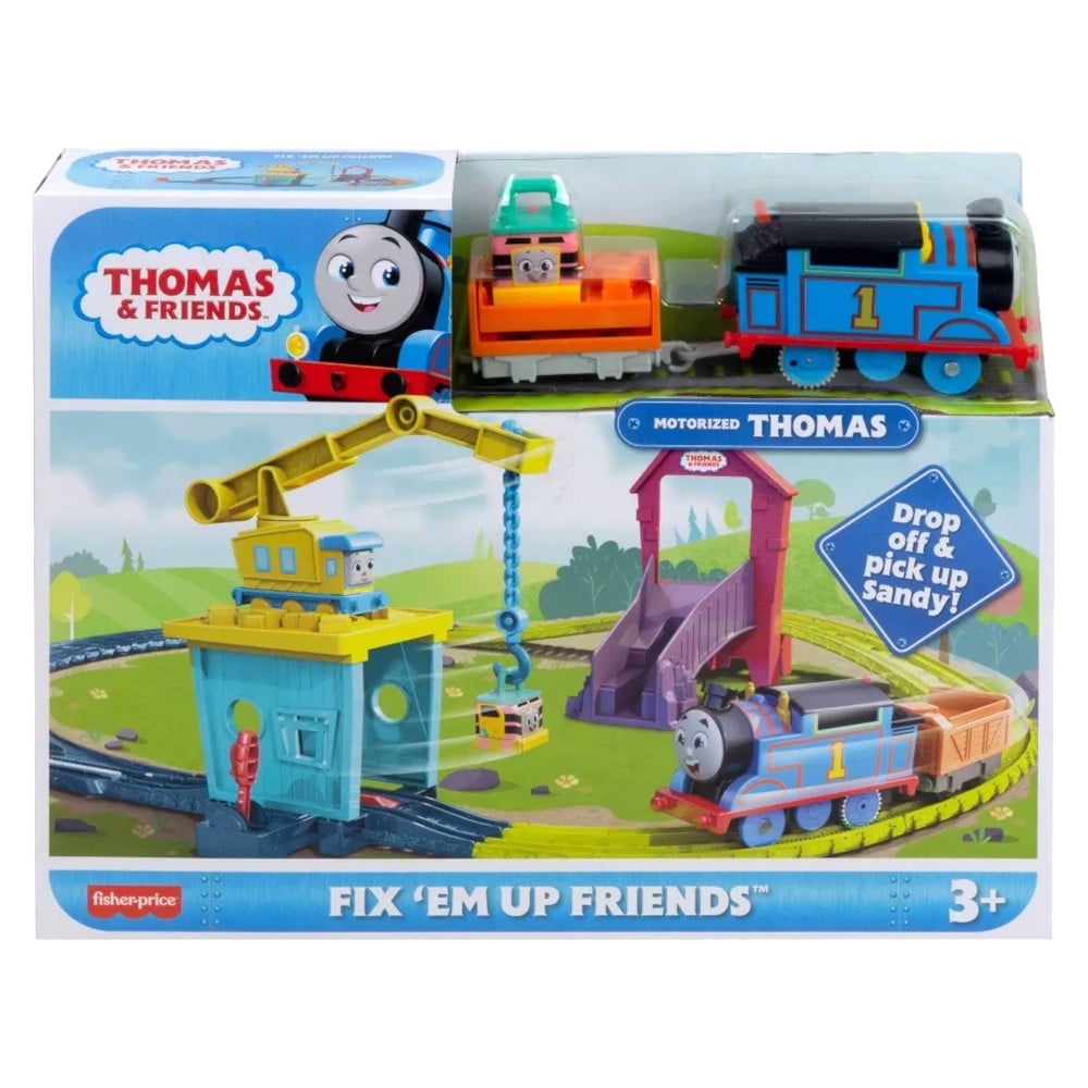 Femijet mund të rijetojnë momente të paharrueshme me personazhet e tyre të preferuar nga shfaqja Thomas & Friends me këngën Fix'em Up Friends të vendosur nga Fisher-Price. Së bashku me një motor të motorizuar Thomas, ky grup treni përmban personazhe të rinj, Carly Crane dhe shoqen e saj më të mirë, Sandy the Rail Speeder. Carly the Crane përdor grepin e saj për të ngritur dhe ngarkuar motorin e vogël në makinën e ngarkesave të Thomas për një udhëtim. Pasi Thomas zmadhon rrethin e plotë të pistës, ai e lëshon shpejtësinë e hekurudhës Sandy në rrëshqitje për ta çuar përsëri te Carly the Crane.