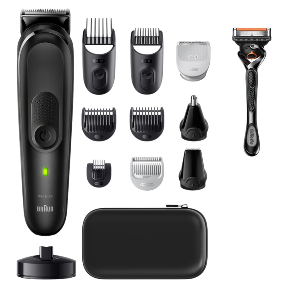 Braun All-In-One Series 7 MGK7460, komplet 12 në 1 për mjekër, flokë, rruajtje dhe më shumë. Kujdesi nga koka te këmbët me kompletin për stilimin e mjekrës, flokëve dhe rrojës Braun të Gjithë-në-Një Series 7. Me një teh metalik të besueshëm, teknologji AutoSense dhe 100 minuta kohë funksionimi. Përmbajtja e kutisë: 1 prerëse1 kokë prerëse metalike 1 kokë prerëse trupi 1 kokë prerëse precize 1 kokë prerëse për veshët dhe hundë 1 krehër mjekre (3-11 mm) 1 krehër flokësh (13-21 mm) 1 krehër standard (1 mm) 1 krehër (2 mm) 1 krehër zonë e ndjeshme 1 kapak vetullash 1 brisk Gillette ProGlide 1 brisk Gillette ProGlide 1 furçë pastrimi 1 bazë karikimi 1 kuti ruajtëse.