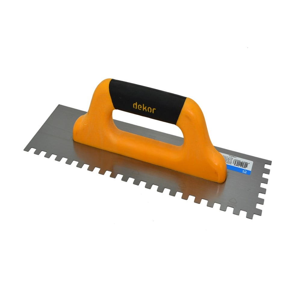 Malle Kolle Dekor, 120x300 mm (10x10 mm) është e prodhur nga çelik special i cili ruan formën e mëparshme pavarësisht deformimit dhe me dorezë plastike. Përdoret për aplikimin e kollës mbi sipërfaqe të mëdha si qeramikë, pllaka për veshje, pllaka shtrimi etj.