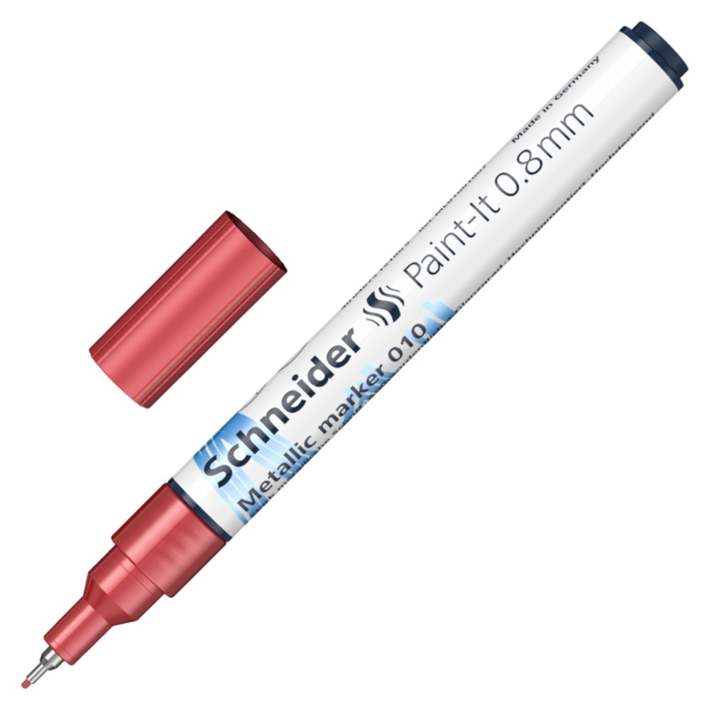 Marker me bojë metalike për të marrë efekte të jashtëzakonshme. Majë e imët për një gjerësi vije prej afërsisht 0,8 mm. Ngjyra e bojës e kuqe metalike. Teknologjia e re e pigmentit lejon aplikim të pastër dhe homogjen të ngjyrave. Grimcat e aluminit të veshura me pigmente me ngjyra prodhojnë një efekt shumë metalik me një nivel jashtëzakonisht të lartë shkëlqimi, madje edhe nën incidenca të ndryshme drite. I përshtatshëm për shumë sipërfaqe. Rezultatet më të mira merren në sipërfaqe të errëta, jo absorbuese. Bojë me tharje të shpejtë e kontrolluar në mënyrë efektive nga një valvul.