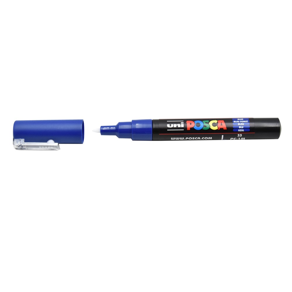 Marker Posca, me trashësi maje PC-1 mm, prej materaili plastik në ngjyrë blu. E përshtatshme për të shkruar në xham, dru, qeramike, qelq. Përdoret në industri.