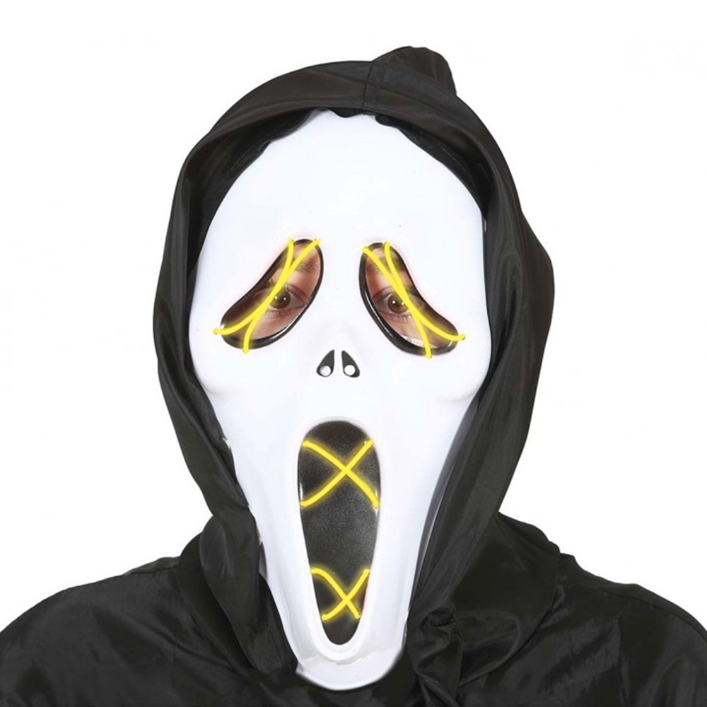 Maskë vrasësi me kapuç, për Halloween, prej materiali PVC-je, në ngjyrë të zezë. Përdoret si aksesor për veshje të ndryshme Halloween-i apo karnavalesh.