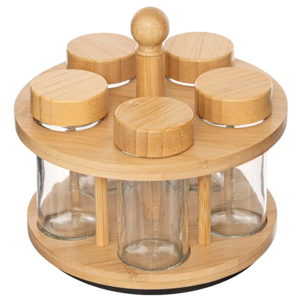 Kjo mbajtëse erëzash Cozy, prej bambu dhe qelqi, me ngjyrë transparente dhe natyrale, është ideale për të ruajtur dhe organizuar erëzat në mënyrë të thjeshtë dhe elegante. Me diametër 17 cm dhe lartësi 17.5 cm, ofron hapësirë të mjaftueshme për kavanoza dhe shishet e erëzave, ndërsa materiali i qelqit lejon të shihni përmbajtjen menjëherë. Bambu i qëndrueshëm siguron përdorim afatgjatë dhe një pamje natyrale në kuzhinë.